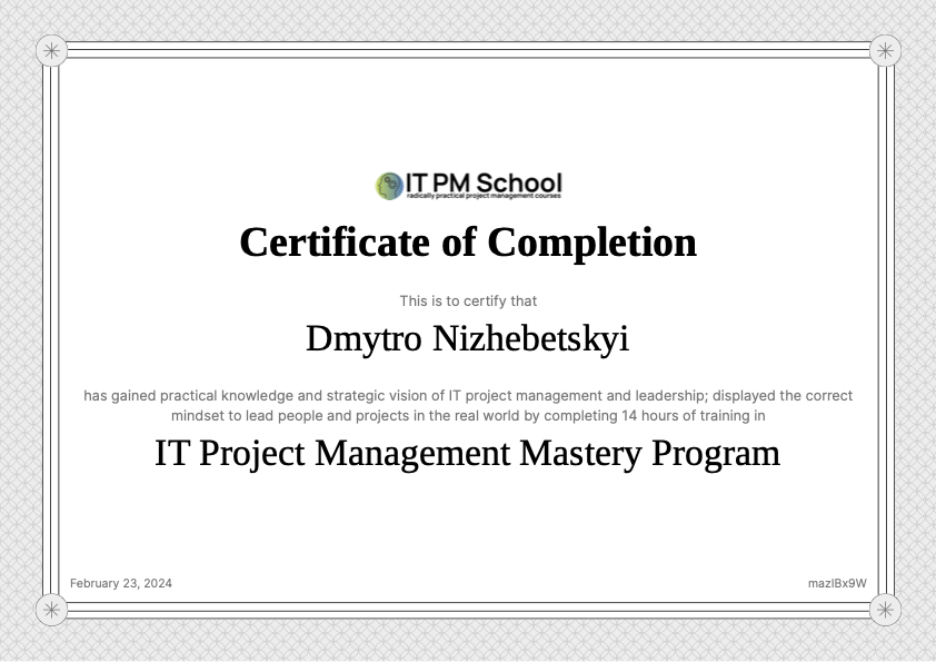 "This course helped me to create a real picture of Project Management and the PM's key responsibilities based on the journey from 'starting' to 'finishing' the project. I've structured my knowledge and gained the correct mindset. I feel like I'm ready for my first job as a PM in the IT industry."
